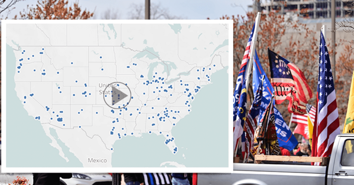 Map developed and designed by Olivia Lawrence-Weilmann. Photo: Proud Boys at World Wide Rally in Raleigh in March 2021 (Credit: Anthony Crider/Flickr).