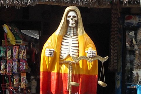 The highway that leads from the Mayan ruins of Chichen Itza back to the resort-lined coast of the Yucatan Peninsula runs straight through several small towns. And there beside the Virgin of Guadalupe and San Judas Tadeo a gargantuan lawn statue of La Santa Muerte—Mexico’s patroness saint of death—looms over the rest.