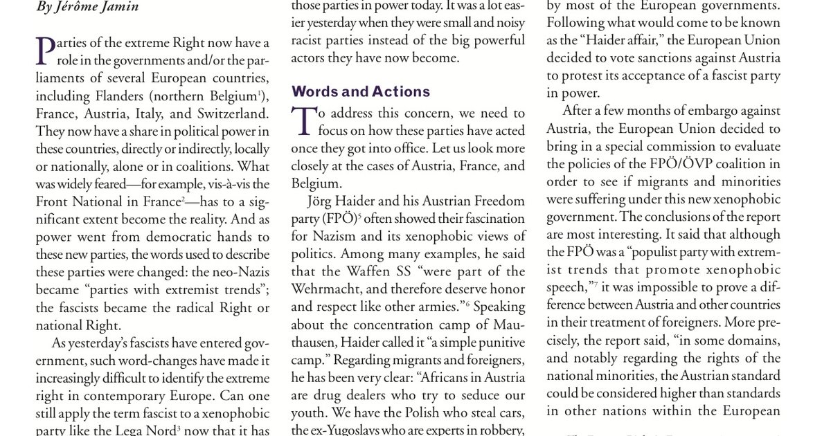 Parties of the extreme Right now have a role in the governments and/or the parliaments of several European countries, including Flanders (northern Belgium), France, Austria, Italy, and Switzerland.