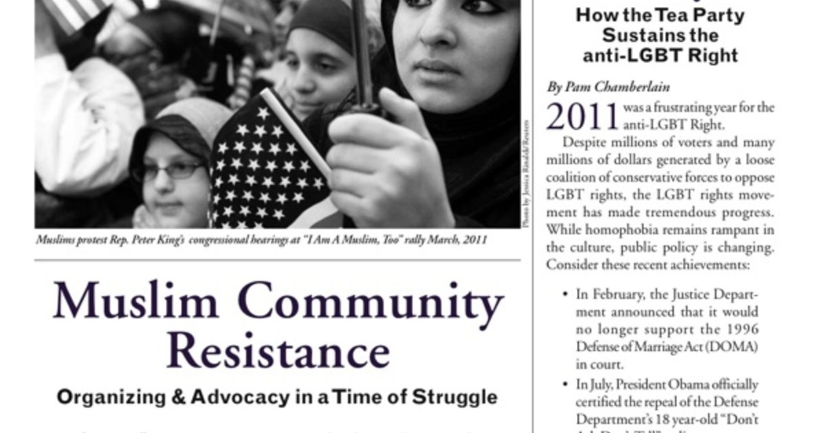In the Spring 2012 issue, P. Adem Carroll describes how Muslim communities are organizing against Islamophobia, Pam Chamberlain studies the Tea Party’s anti-LGBT rights agenda, and Eartha Melzer reports on the consequences of the Department of Homeland Security’s intelligence gathering in Detroit.