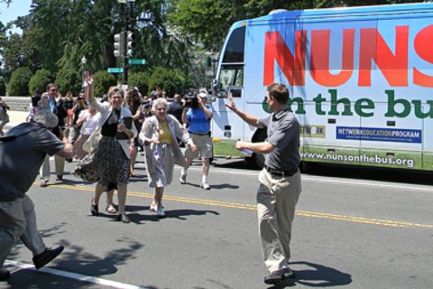 Tourist buses are fixtures on Capitol Hill, but the arrival at the Methodist Building of “Nuns on the Bus: Nuns Drive for Faith, Family and Fairness” in noonday heat to the cheers of their colleagues had to be a first.