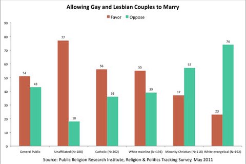 In a new poll, majorities of respondents of all religions, except white evangelicals, support marriage equality.